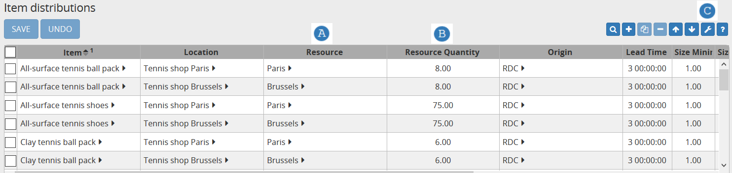 The resource quantity column needs to be set to the weight of the item B. If the resource and resource quantity columns are not be visible in table item distribution, you can make them appear using the wrench key icon C.